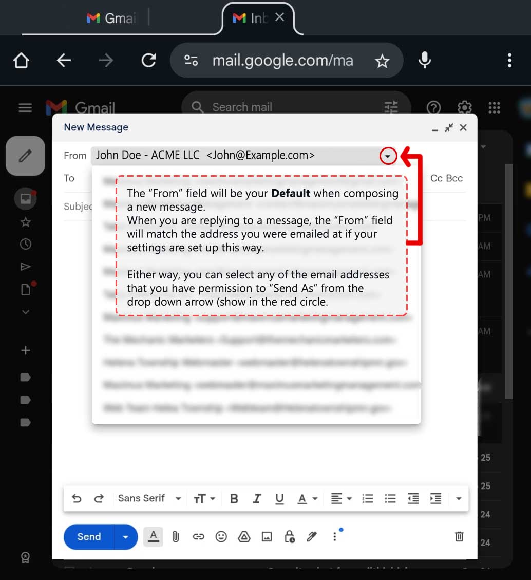 If you don’t immediately see the new email address in the From drop-down menu, don’t stress out yet. The best advice we can offer is: Give It A Few Minutes. This isn’t always necessary, but sometimes the systems need a moment to talk to each other and perform some backend handshakes.