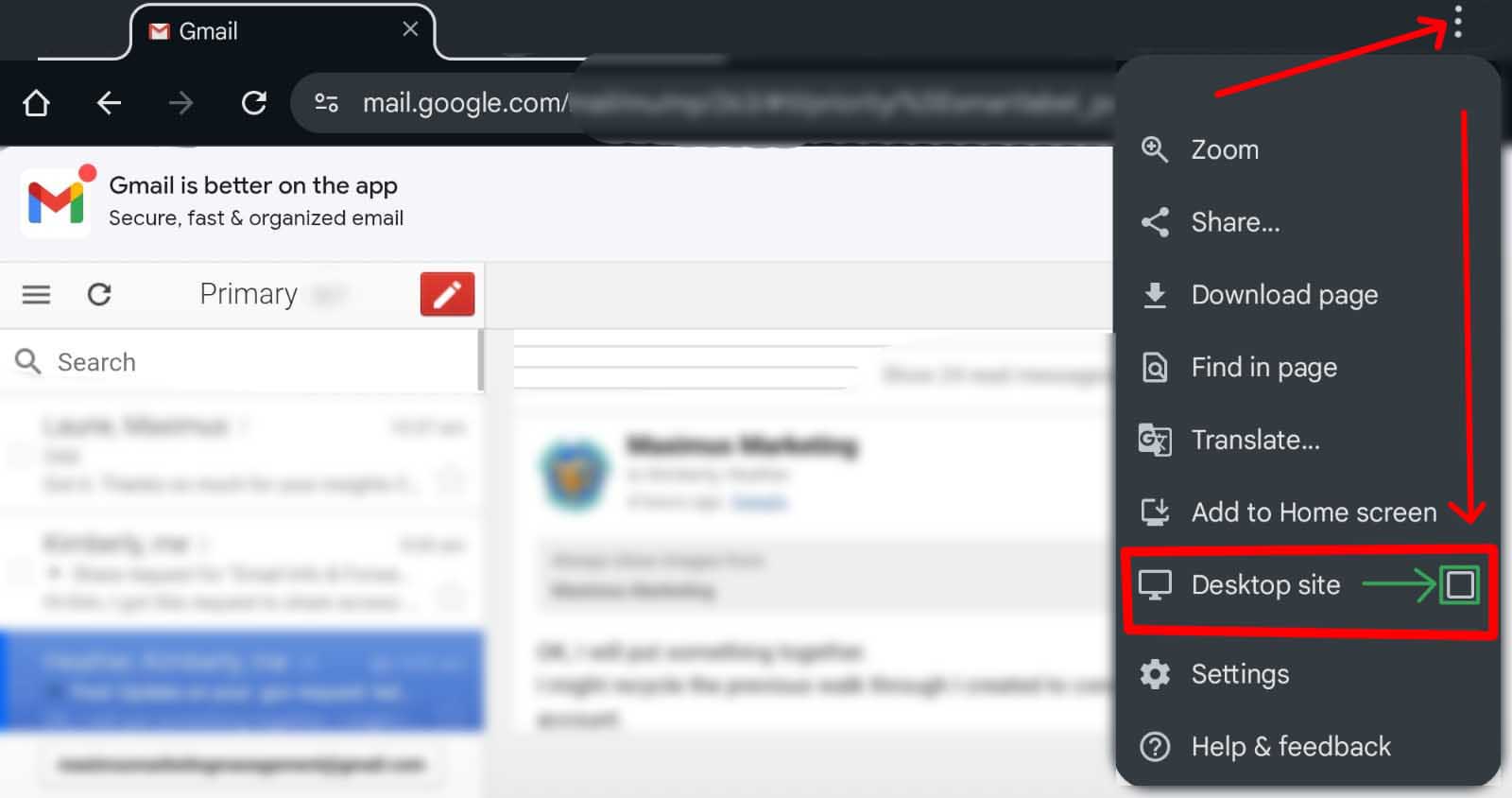 You will need to open a web browser on your mobile device, such as Chrome, Firefox, or Safari and enter the Gmail URL: Https://mail.google.com/ If your browser shows you a big button that says “Open the Gmail App”, look on the screen for smaller text that says: “Use the web version”. This is what you want.