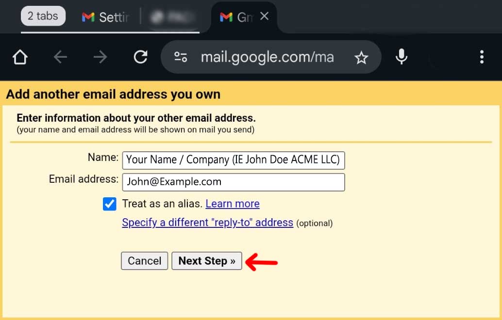 If you want You@Example.com to be your Default address for messages you send out, you will need to set this as the default once you finish these steps and the alias is confirmed. If not you can choose to “Reply from the same address the message was sent to”, which is pretty self explanatory and a great option if your Gmail inbox has several aliases. You can also choose which address to send to on a case by case basis as shown in the previous step.