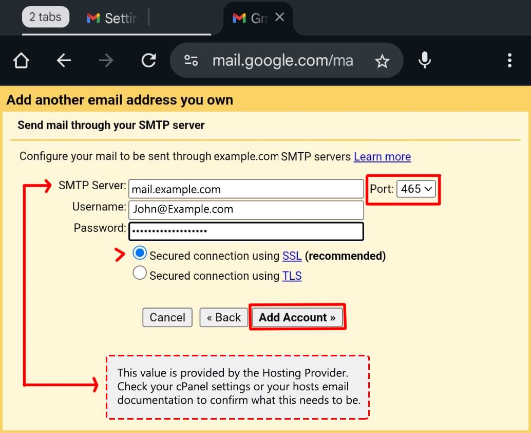 Password: This is NOT your gmail password. This is the password that you (or your IT/Web Dev) created in cPanel or your hosts admin panel. If you didn’t create this, then this should have been sent to you by your system admin.