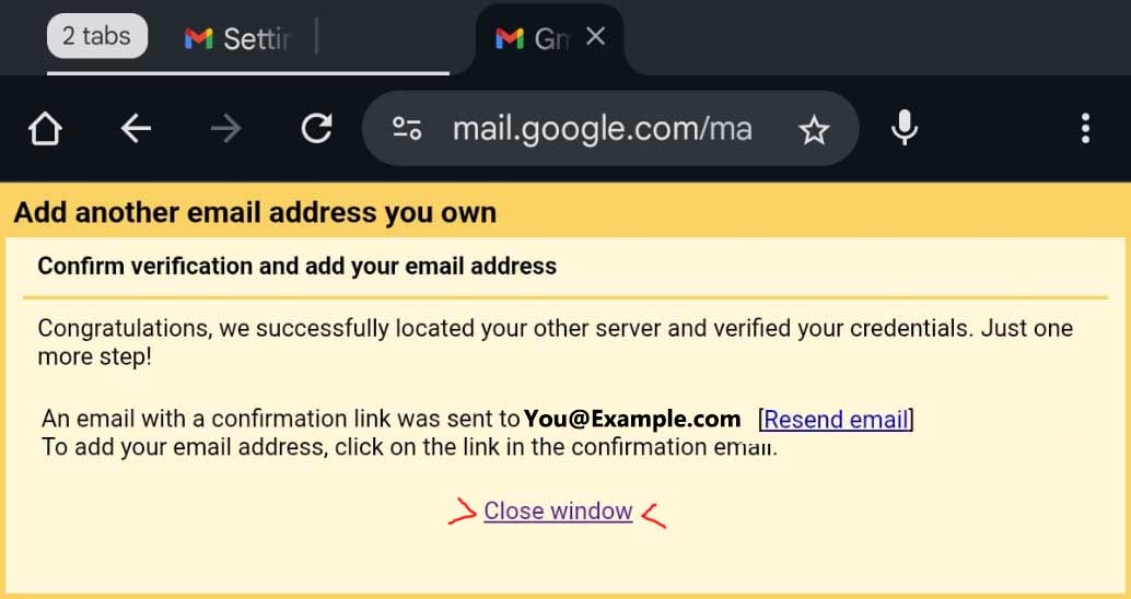 If you want to play it safe, open your Gmail inbox in another window, use the app, or go to your domain’s inbox by another method to look for a new message at You@Example.com. This is why we said at the outset that you should have set up the forwarding for this address before starting this process. This last popup/screen will give you the option to [Resend email] or just Close window.